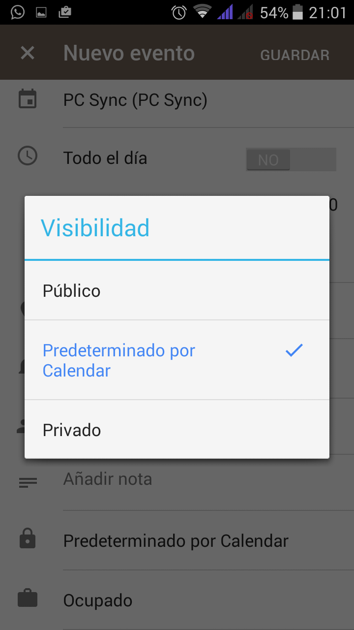 Desde Mis Calendarios es donde podemos encontrar la opcion para crear nuevo,en él configuraremos las opciones que vayamos a necesitar como se ve en la imagen de abajo, le ponemos un nombre ,una descripción (citas,cumpleaños,pendiente...)
