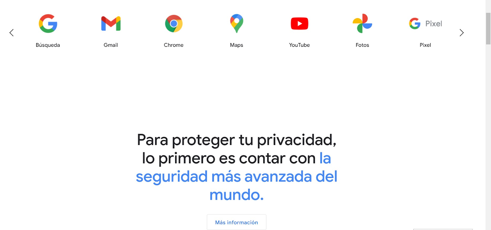 La primera es donde se explica cada uno de los productos de Google que tienes con tu cuenta como son Mapas (google maps) ,Videos (youtube) , Correo (gmail), Fotos (google fotos) ,Almacenamientogratuito hasta 15 Gb (drive), Video Conferencias (Duo), Calendario (google calendario) , Reuniones (Meet), Asistente de google, Pagos (G-Pay),